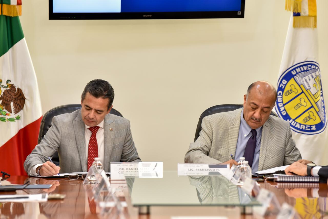 La firma de ambos convenios de colaboración estuvo a cargo del secretario de Educación y Deporte, Francisco Hugo Gutiérrez Dávila; y el rector de la UACJ, Daniel Alberto Constandse Cortez.