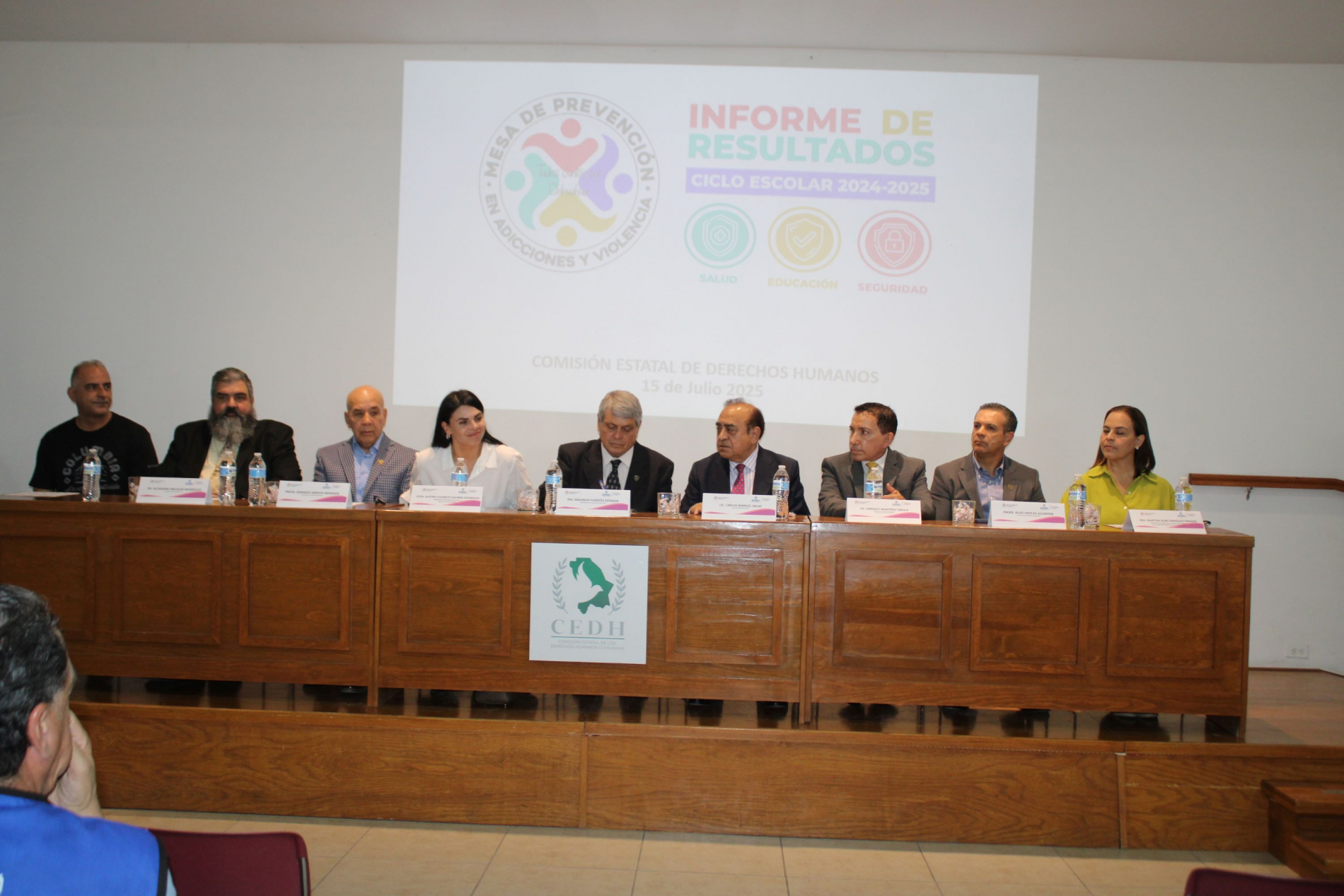 Lo anterior, en el marco de la presentación del Informe de Resultados del Ciclo Escolar 2024-2025 del Programa de Prevención de Adicciones y Violencia en las Escuelas, el cual se llevó a cabo en el auditorio de la Comisión Estatal de Derechos Humanos (CEDH), ante la presencia de representantes de diversos sectores.