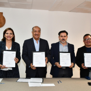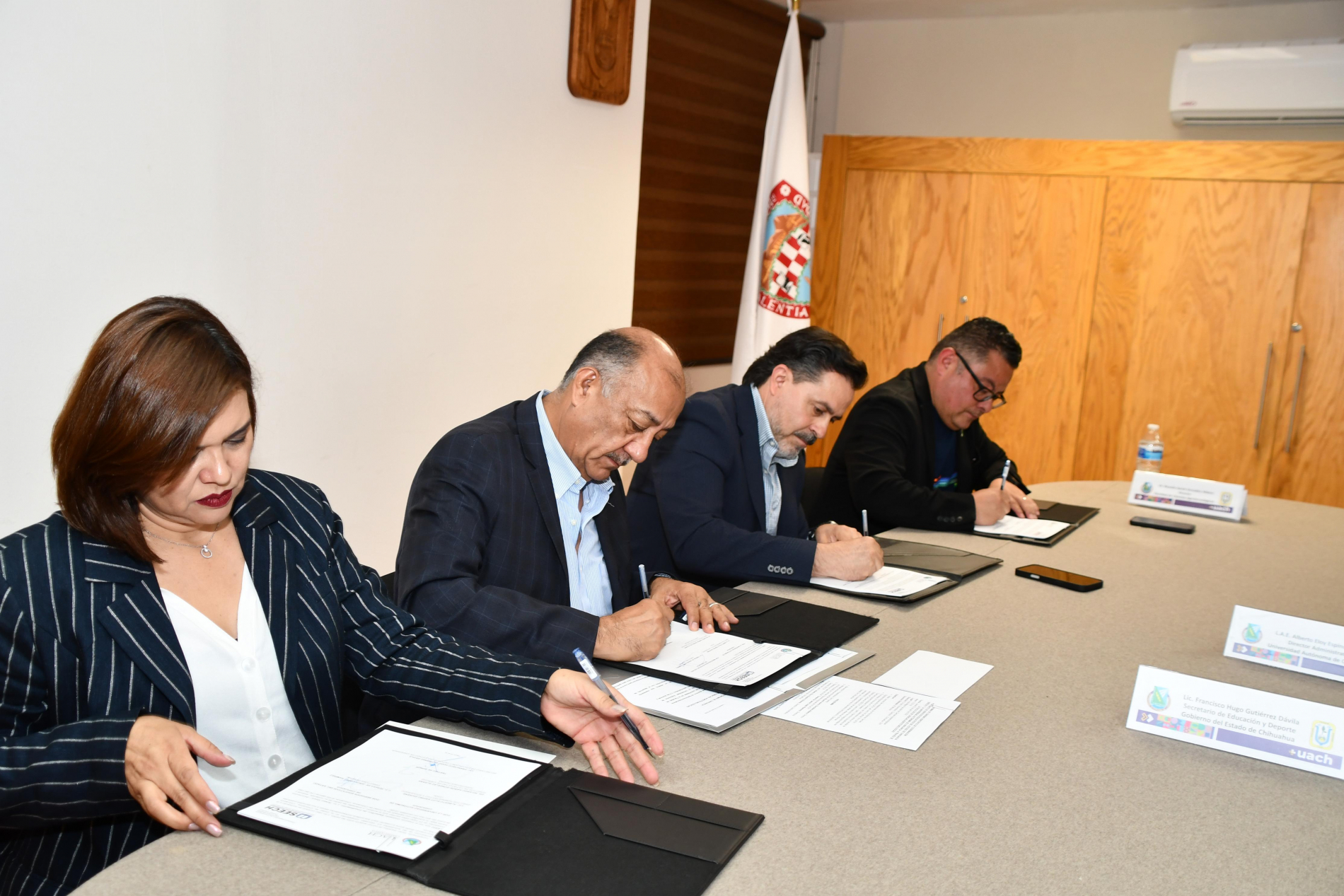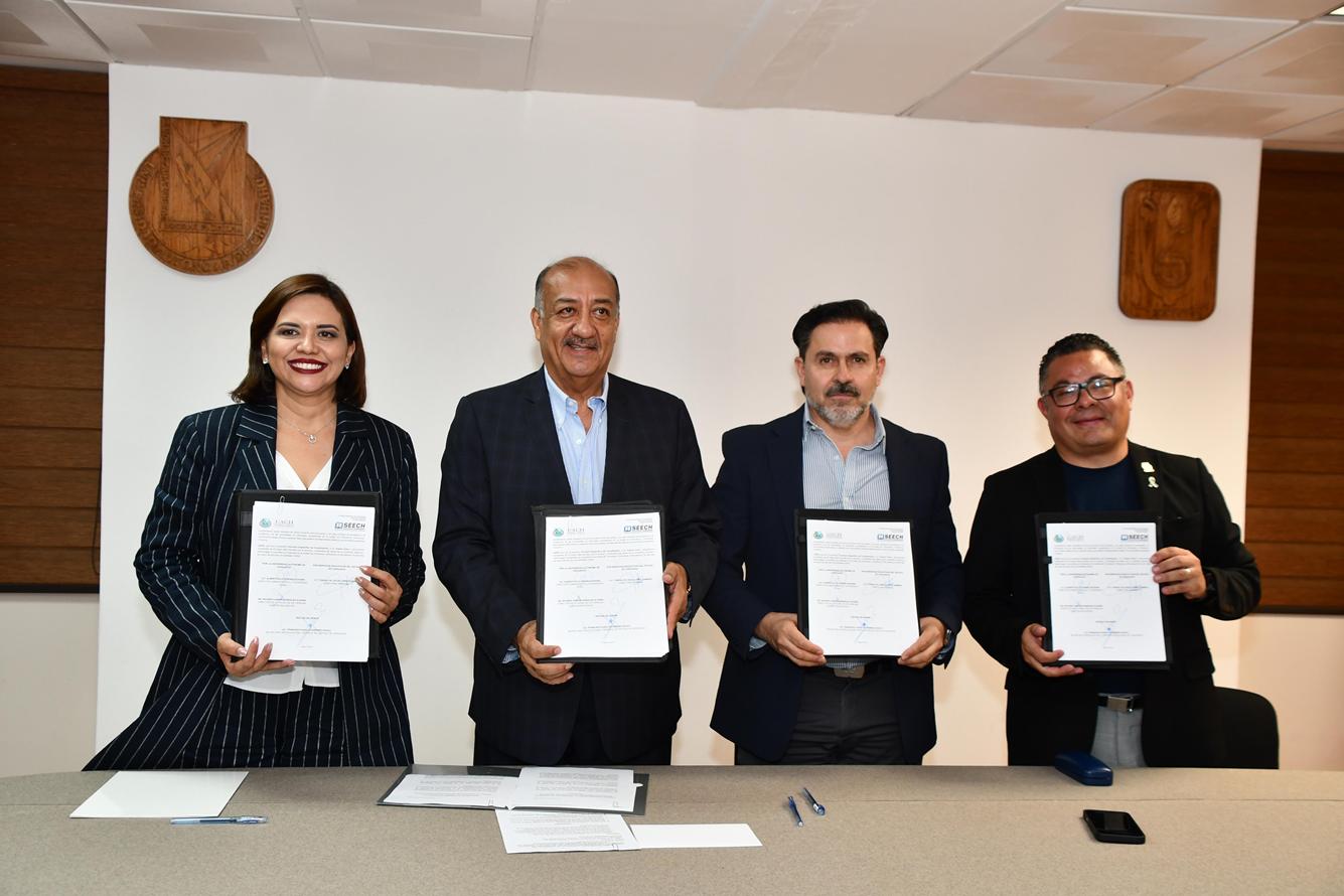 El acuerdo fue signado por la directora general de SEECH, Teresa de Jesús López Ramírez, y el director de Faciatec, Ricardo Aarón González Aldana, con el titular de la SEyD, Francisco Hugo Gutiérrez Dávila, y el rector de la UACH, Luis Alfonso Rivera Campos como testigos de honor.